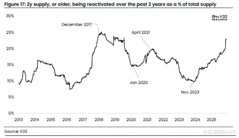 根据K33 Research的报告,自2023年初以来永崋证券,至少两年未发生转移的比特币数量已减少约160万枚,按当前价格计算价值约1400亿美元。这一变化被视为长期持有者持续兑现收益的明确信号。