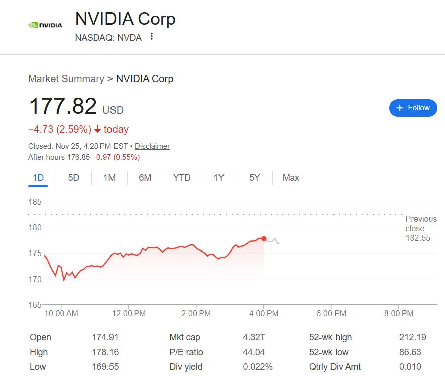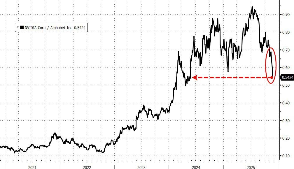 本周二早盘弘大速配,英伟达股价一度重挫逾7%,市值蒸发近3500亿美元,后跌幅收窄,收跌2.6%,收创两个多月新低,而谷歌母公司Alphabet股价则进一步走高,早盘曾涨超3%,尽管此后回吐部分涨幅,仍收涨1.6%,连续第三个交易日创收盘历史新高。