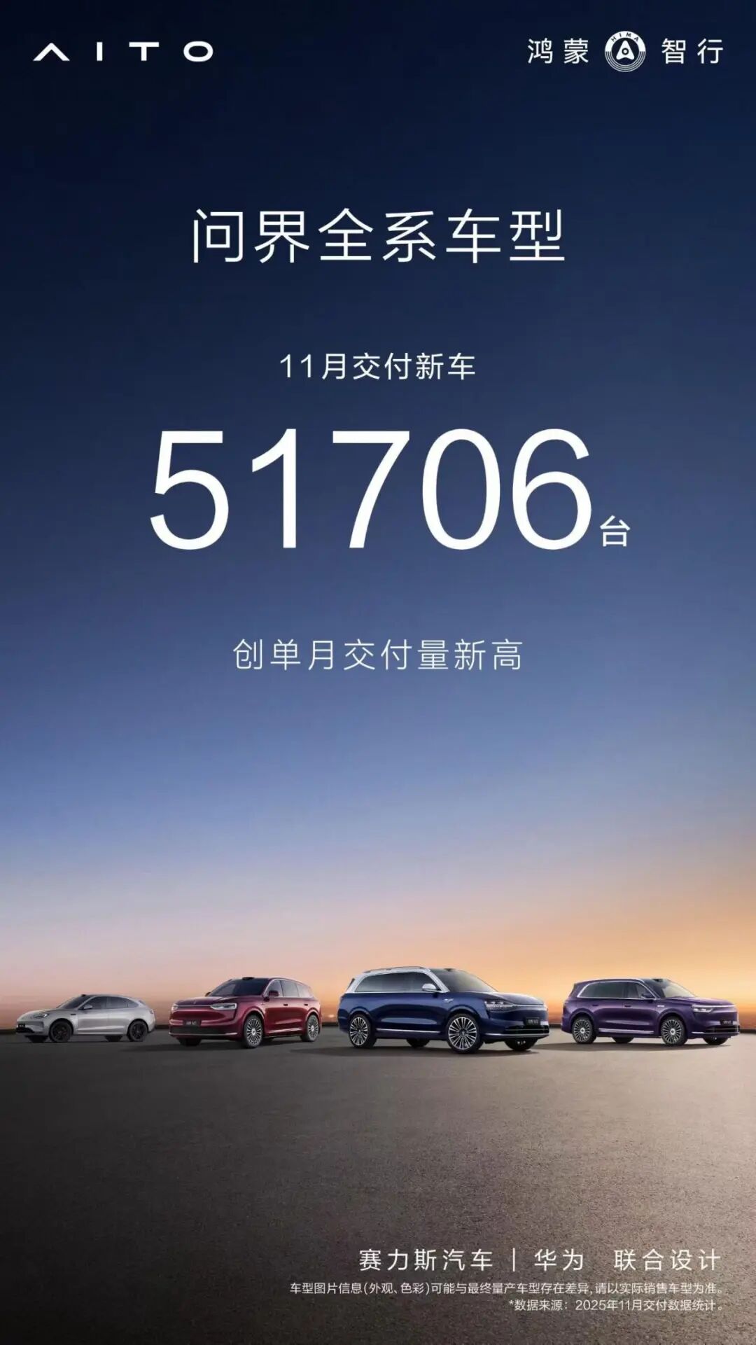 在刚刚过去的11月,问界交付量一举突破5.1万辆,刷新品牌纪录。