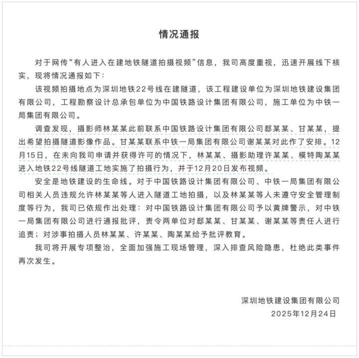 安全是地铁建设的生命线。对于中国铁路设计集团有限公司、中铁一局集团有限公司相关人员违规允许林某某等人进入隧道工地拍摄,以及林某某等人未遵守安全管理制度等行为,我司已依规作出处理:对中国铁路设计集团有限公司予以黄牌警示,对中铁一局集团有限公司进行通报批评,责令两单位对郄某某、甘某某、谢某某等责任人进行追责;对涉事拍摄人员林某某、许某某、陶某某给予批评教育。